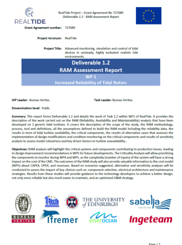 The RealTide Deliverable D1.2 - RAM Assessment Report provides a description of the results of a reliability, availability and maintainability (RAM) assessment conducted on a generic tidal turbine. Critical systems and components will be identified. Based on scenarios defined by the consortium, sensistivity analysis of the impact of key choices will be assessed (component selection, electrical architecture, maintenance strategy,...)