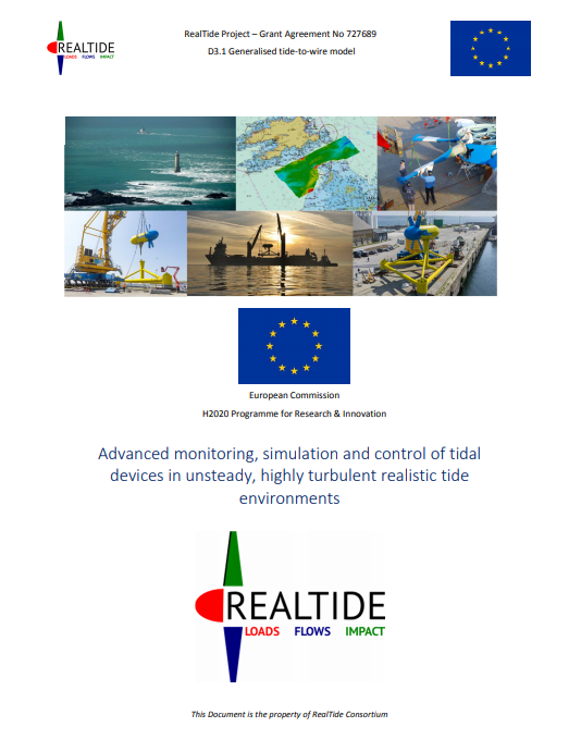 Summary: The objective of the task T3.1 is to develop a time dependant tide-to-wire model using blade element momentum theory (BEMT) to calculate the torque and thrust on a tidal turbine. From an input of the tidal conditions, the tool is also able to predict the power output in terms of electrical parameters and accounts for realistic tidal conditions such as turbulent and unsteady flow.